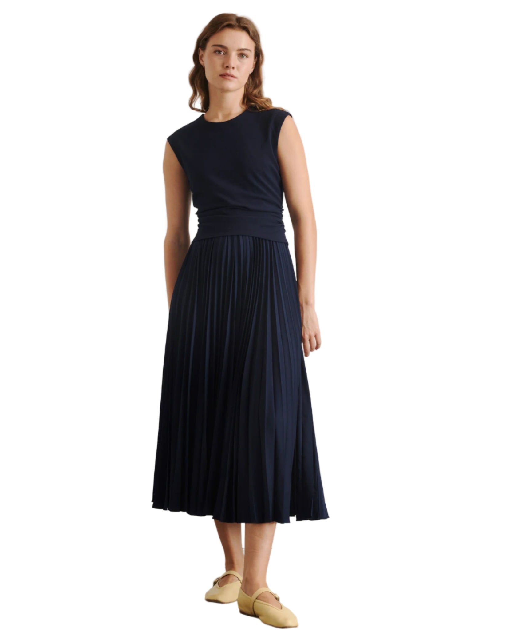 Designed in a luxe scuba crepe, the Carly is a polished silhouette with side ruching at the waist for a modern flattering detail and an effortless pleated skirt that will glide along with you.