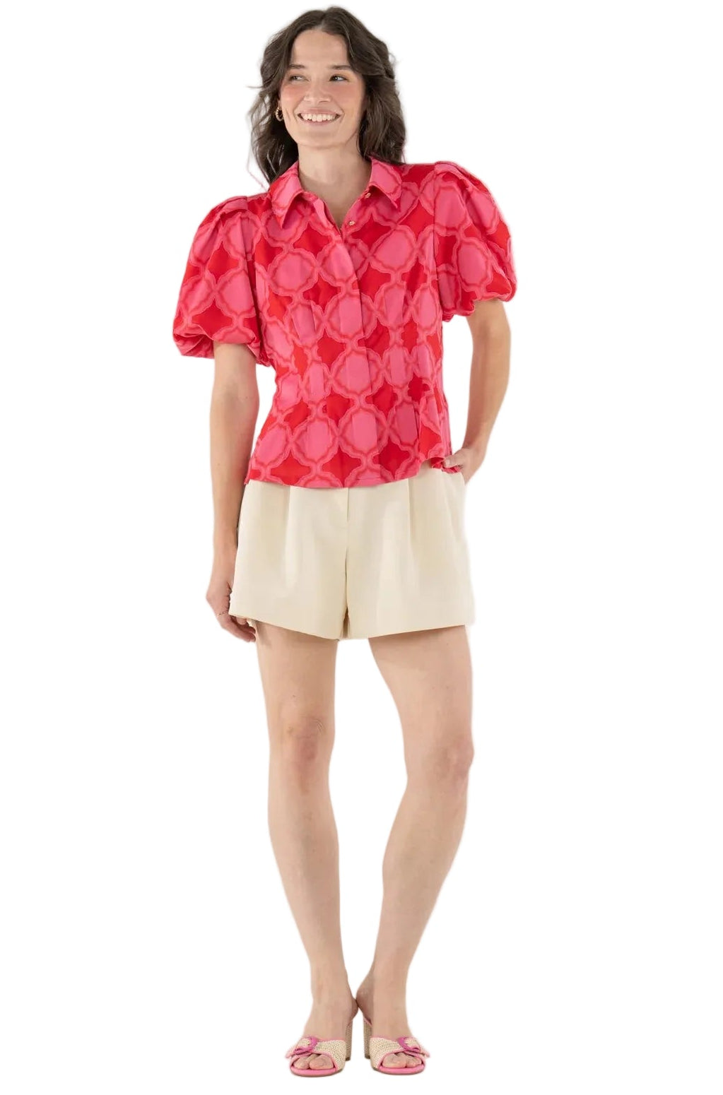 The Britt Top in Villa blends tailored structure with romantic volume, featuring a classic fold collar, softly puffed sleeves, and a lightly boned bodice that creates a flattering, sculpted shape. A subtle peplum hem adds gentle movement while maintaining a clean, structured look. Fabricated in the Villa jacquard print—a textured, feminine pattern inspired by the mosaic tilework of Jaipur—this top feels tasteful yet expressive, offering a statement silhouette designed for elevated everyday moments and beyond.