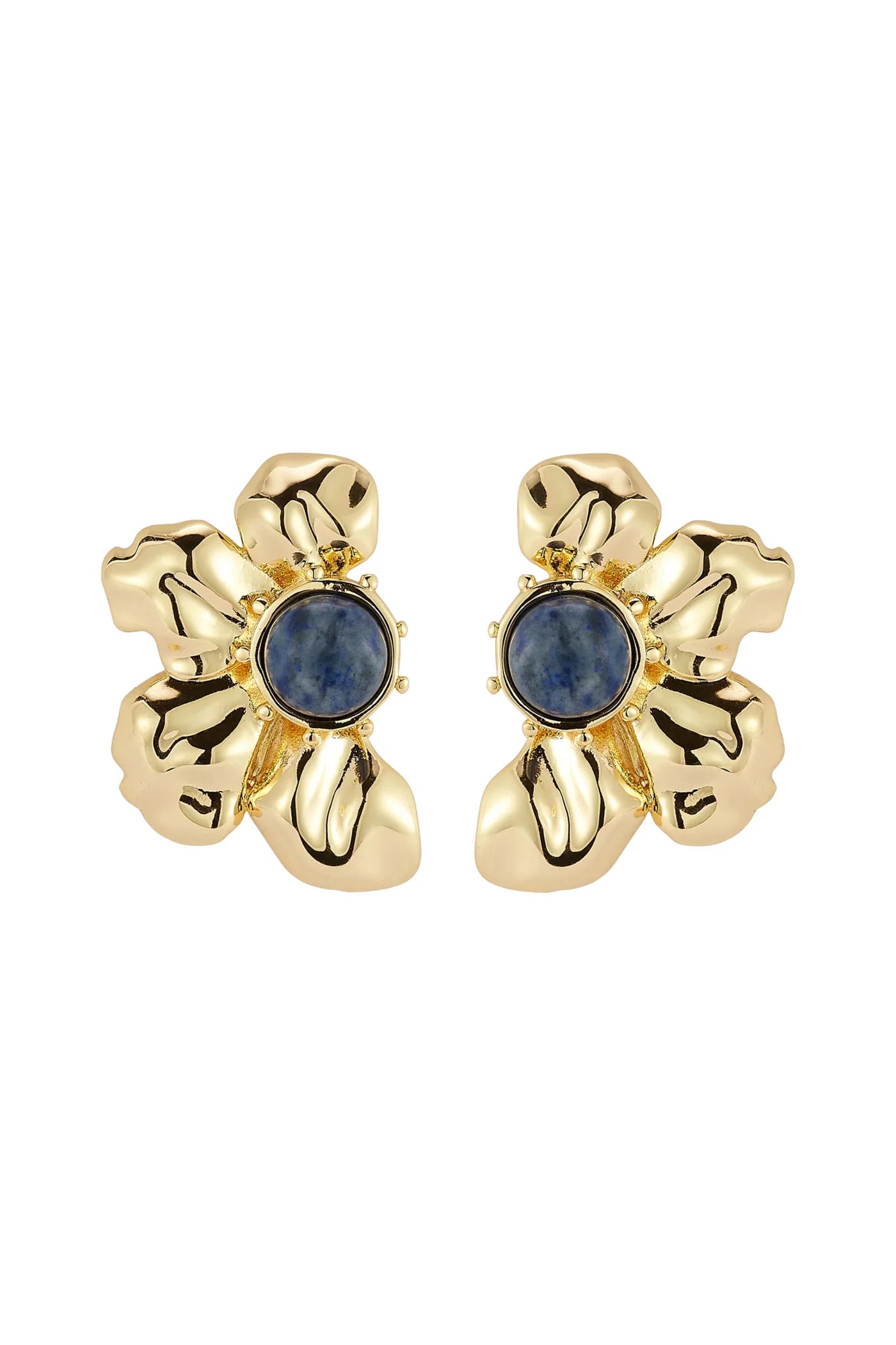 Bold gold petals frame a rich semi-precious lapis center stone in these sculptural flower studs, equal parts timeless elegance and modern edge.