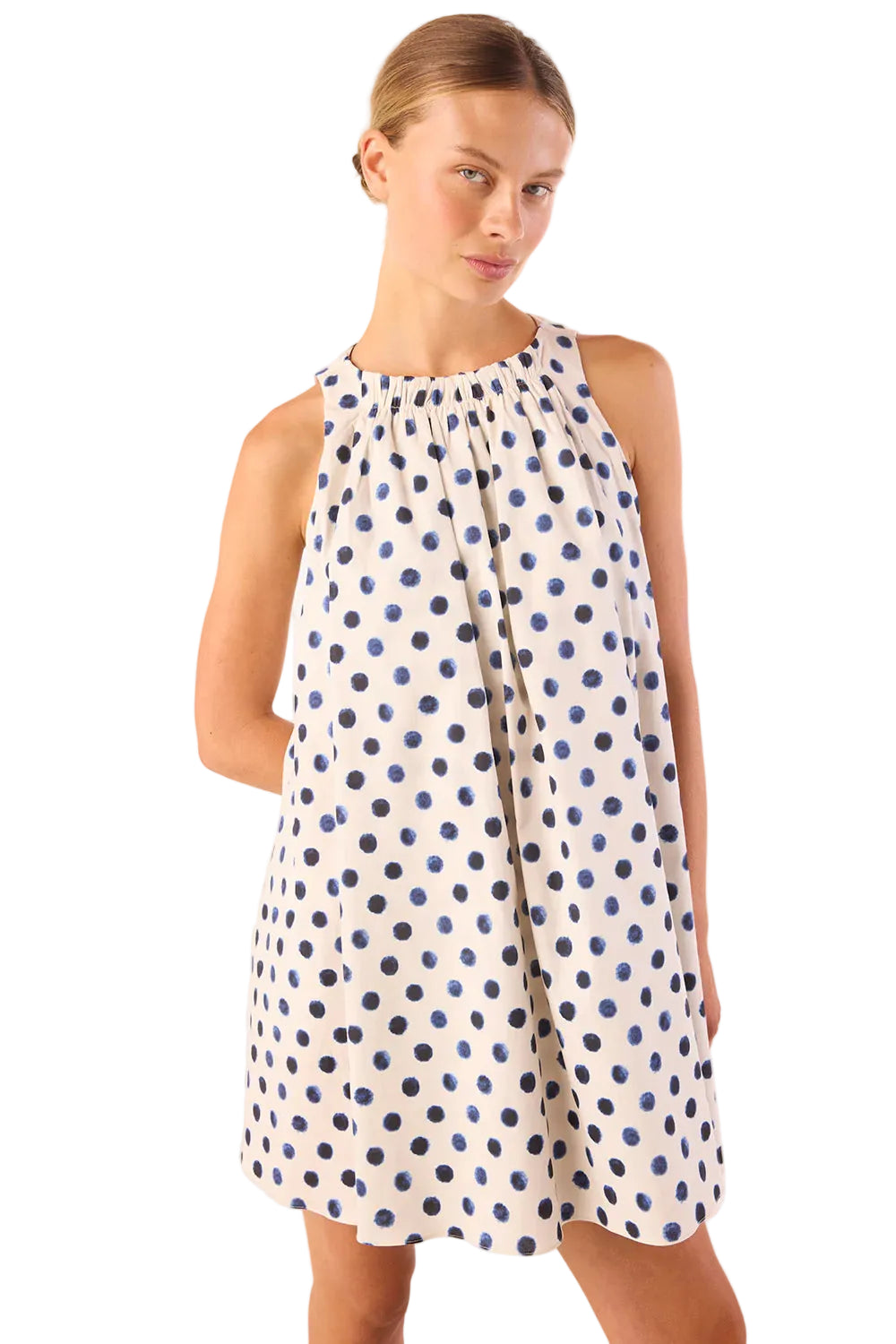 The Louisa dress is a chic, modern voluminous mini shift cut from small-scale navy polka dot–printed cotton poplin on a white ground. Designed with a sleeveless silhouette and high neckline, it features subtle pleated detailing and a relaxed fit with soft volume throughout. A keyhole button closure at the back of the neck completes the look. Style it with heels or a ballet flat for an easy spring dress that transitions effortlessly beyond the season.