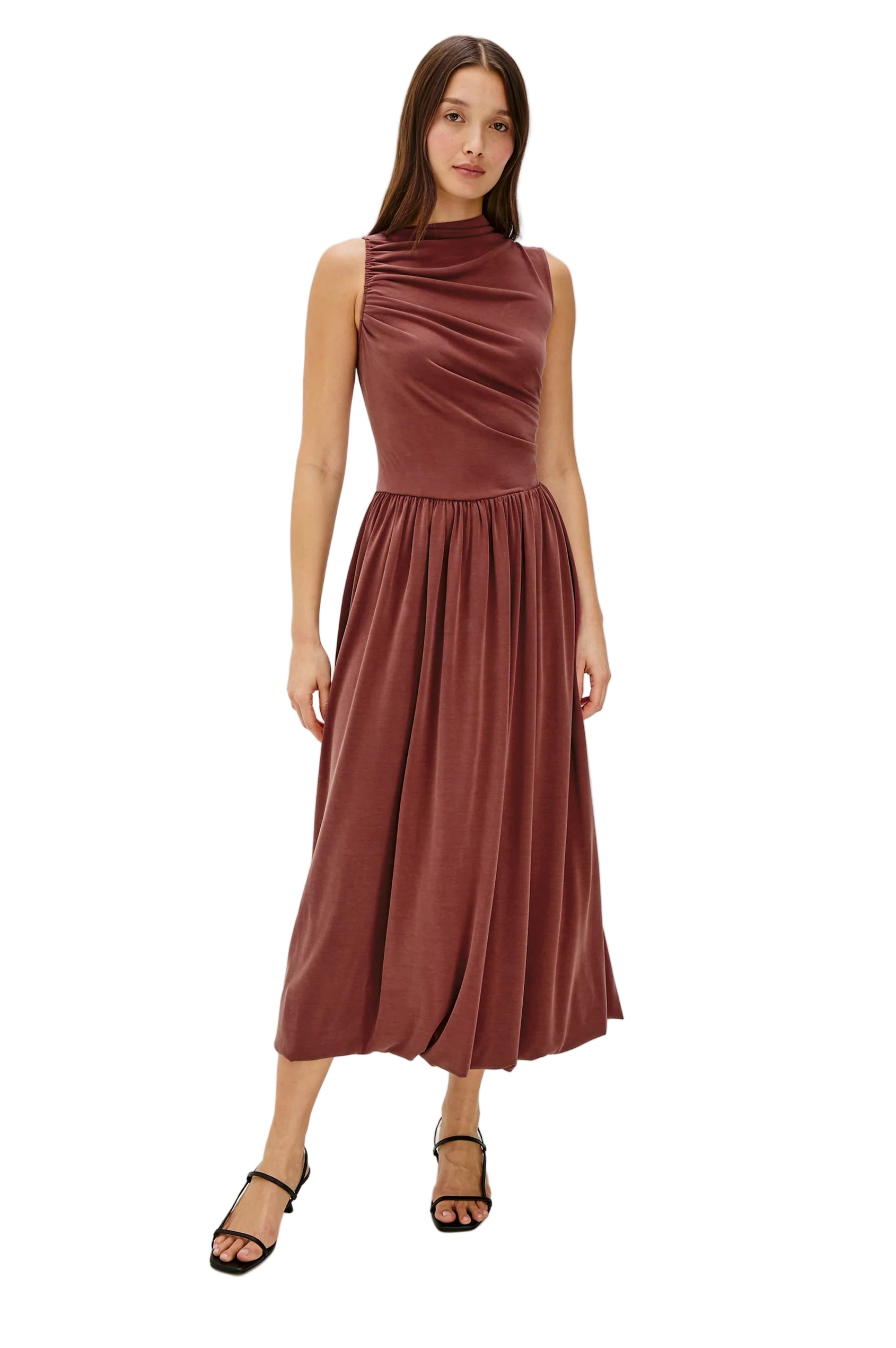 Made from soft jersey, the Brina is a midi-length dress with shirred details for a form-flattering fit. A fitted cowl-neck bodice gives way to an A-line skirt with a bubble hem.