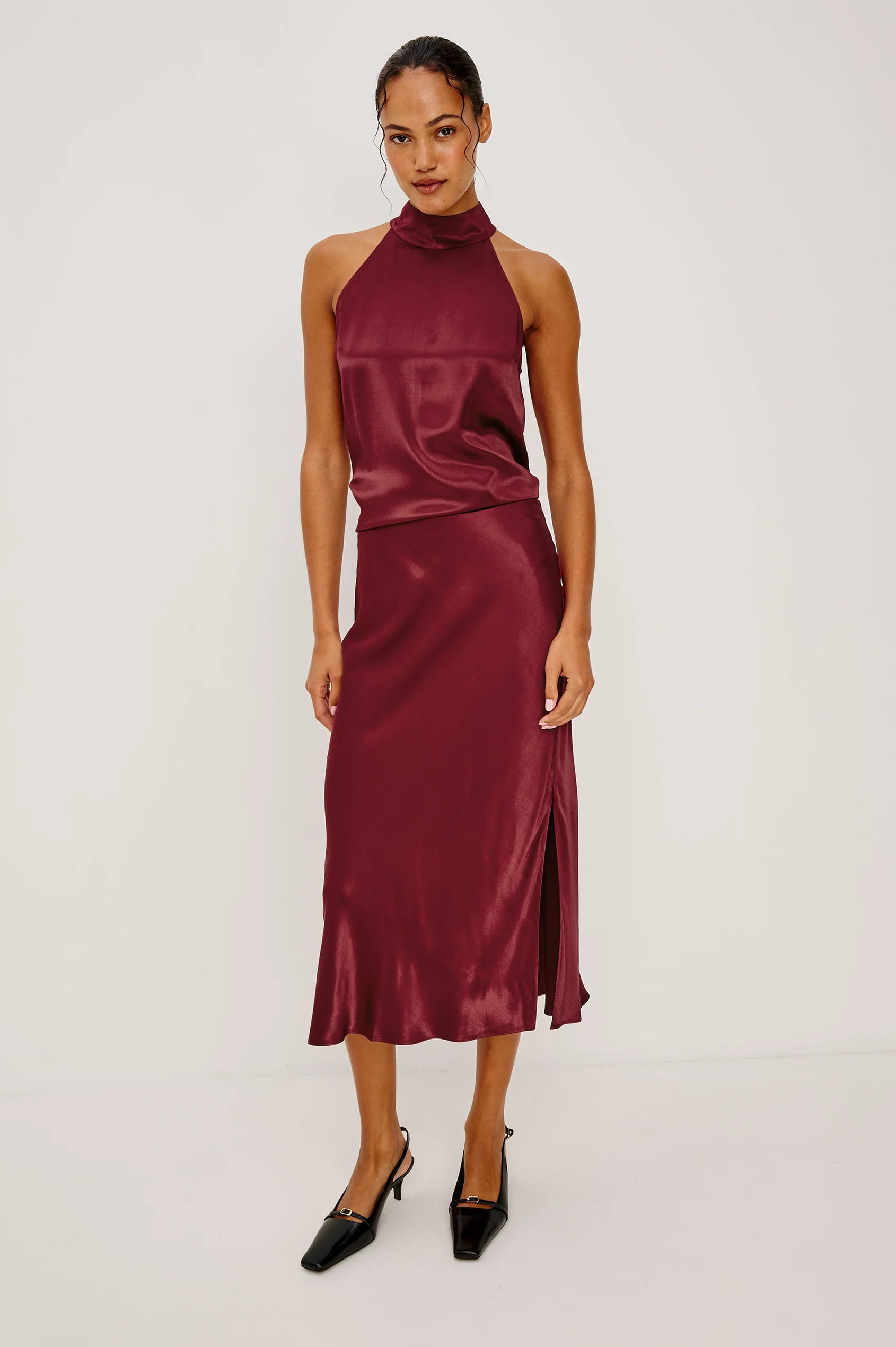Introducing the perfectly proportioned midi. Cut from a luxe satin-back crepe for optimum drape and hand-feel, this slip-style skirt is both comfortable and sophisticated, finished with a subtly revealing front-facing slit.